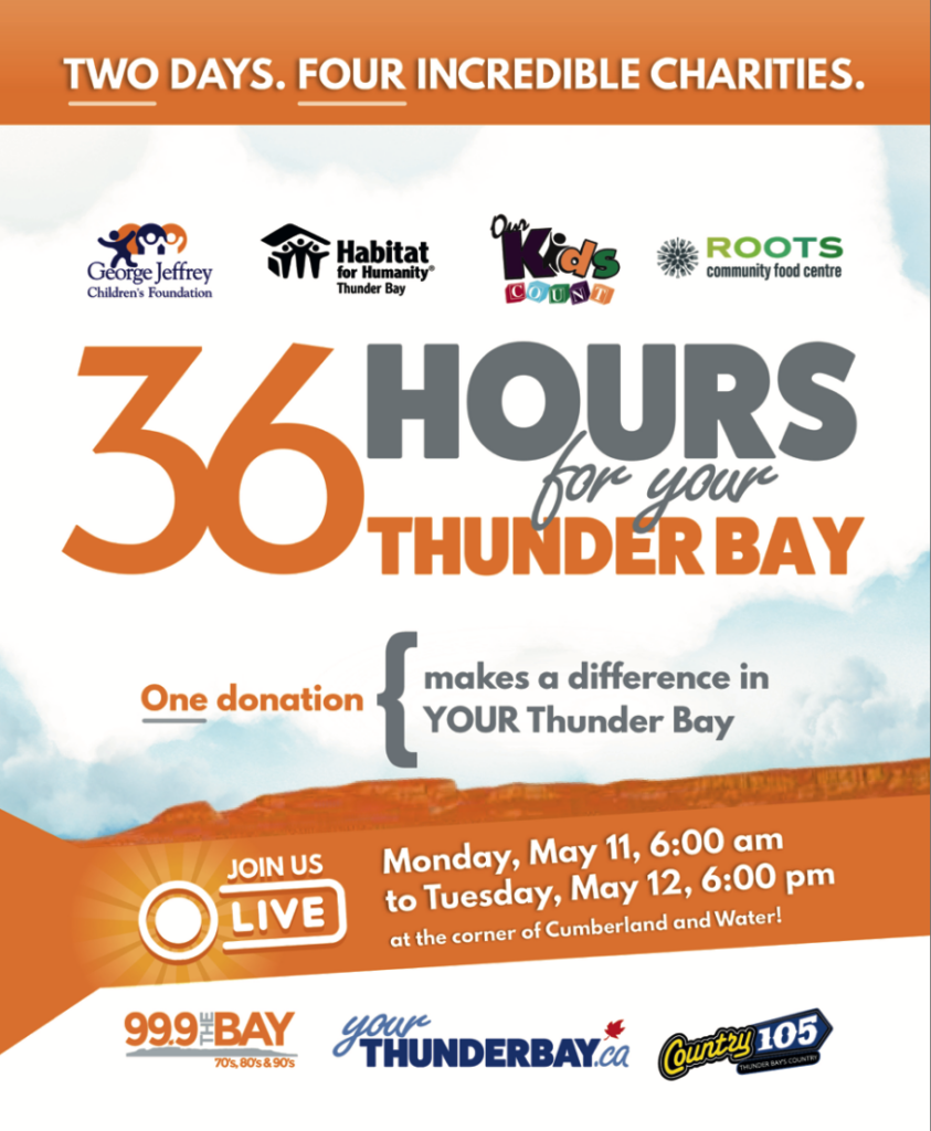 From 6:00 a.m. Monday, May 11 to 6:00 p.m. Tuesday, May 12, the airwaves of 99-9 The Bay and Country 105 will come alive with stories of hope, resilience, and community during 36 Hours for Your Thunder Bay, a first‑of‑its‑kind fundraising event that brings together four cornerstone local charities under one powerful mission.