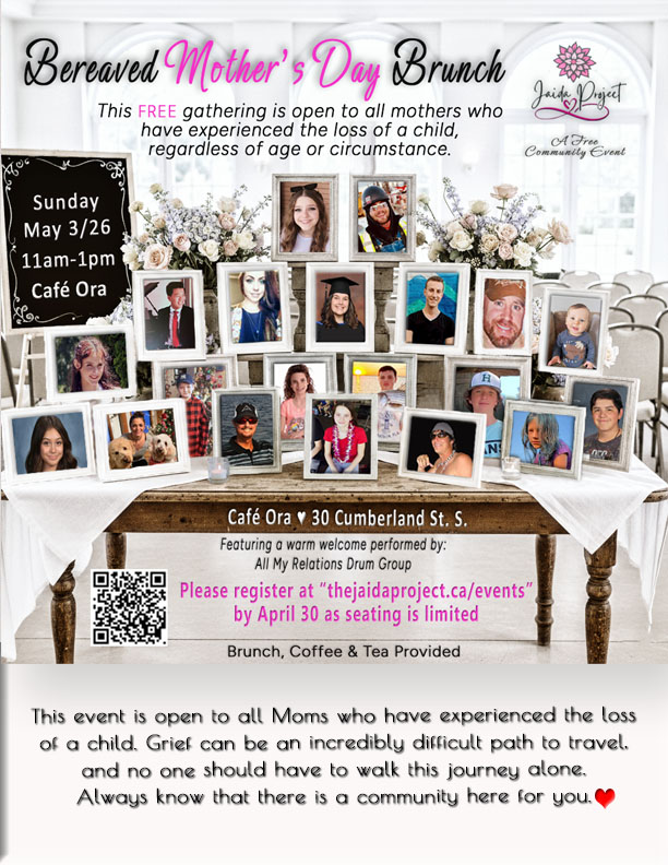 If you are a mother who has experienced the loss of a child, we hope you will join us. If you know a mom who may find comfort in this gathering, please share this with her. Registration is required and available at thejaidaproject.ca/events