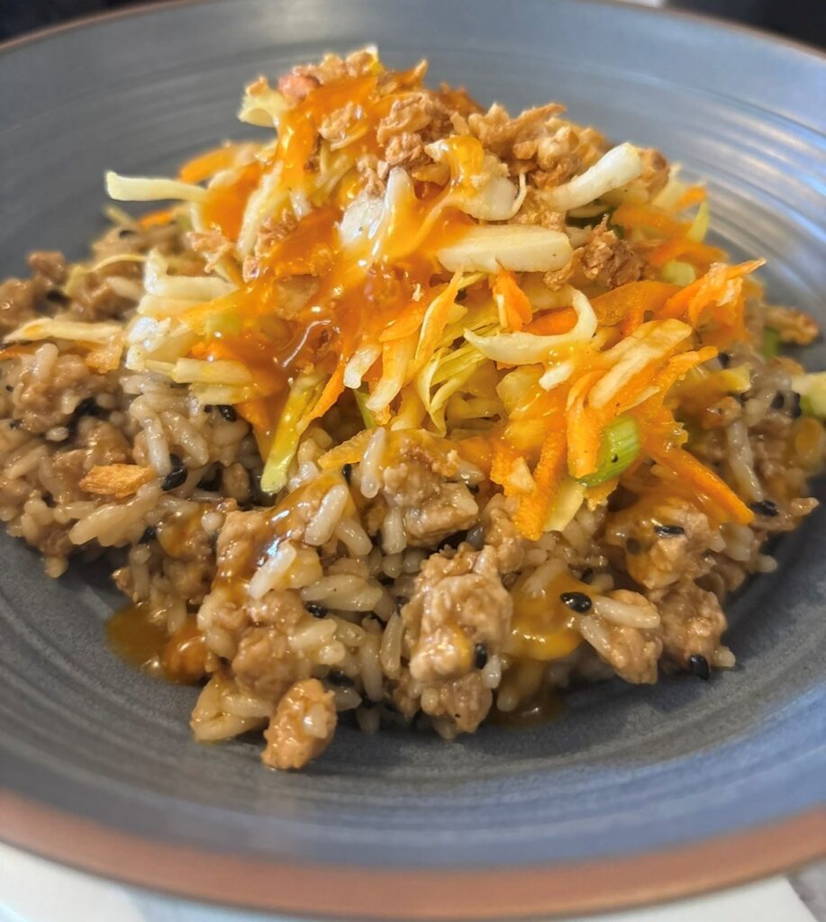 Add cabbage, onion, and carrot then stir to combine with meat. Add soy sauce, sesame oil and sriracha. Cook, stirring frequently, until cabbage is tender, 5 to 8 minutes; season with salt.