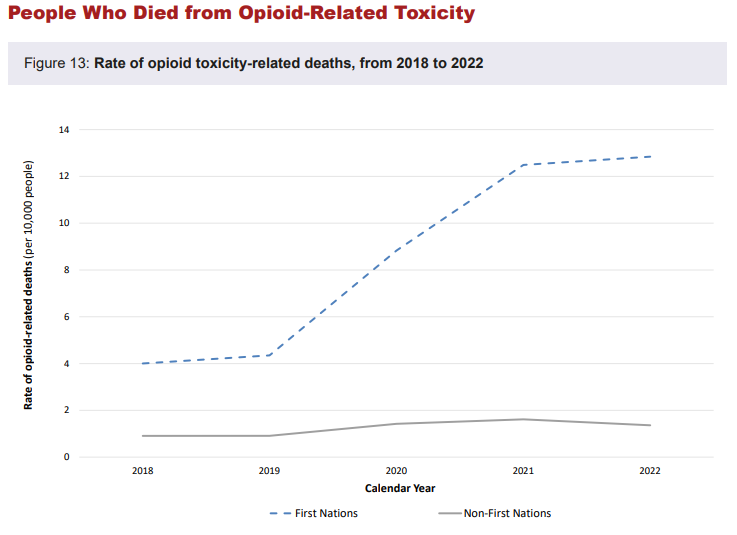 A report released on Monday morning has found that in 2022, First Nations people in Ontario were killed by opioids at nine times the rate of non-First Nations people. In First Nations, opioids caused 12.8 deaths per 10,000 people, while the rate for non-First Nations was 1.4 per 10,000.